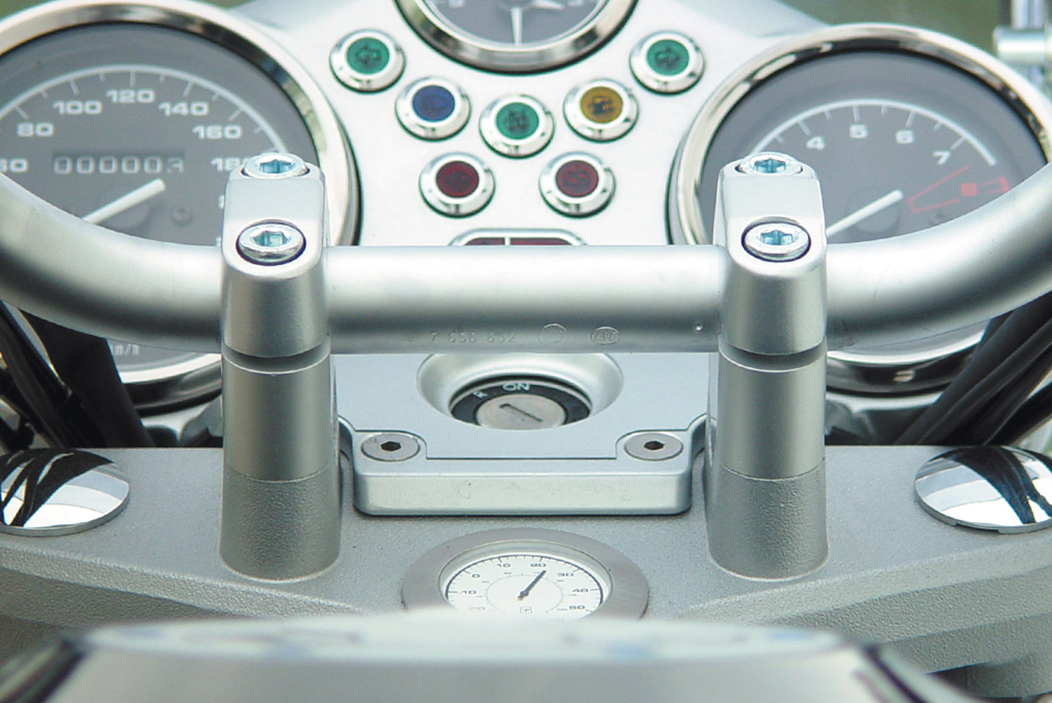 Alza de manillar Wunderlich: Los elevadores de manillares son una opción muy necesaria para mejorar la conducción y la postura. Junto con los asientos más bajos o altos y los juegos de estriberas bajas se puede conseguir la postura de conducción óptima. Estos elevadores de manillar, fabricados en aluminio de alta calidad (torneado) y plata anodizada, son 25 mm altos y te permitirán tener una postura recta pero relajada mientras conduces. Además, son fáciles de instalar ya que incluyen piezas de instalación, y están homologados. Para la R, el elevador de manillar es muy útil, ya que eleva y acerca los manillares al piloto, resultado en una buena postura.