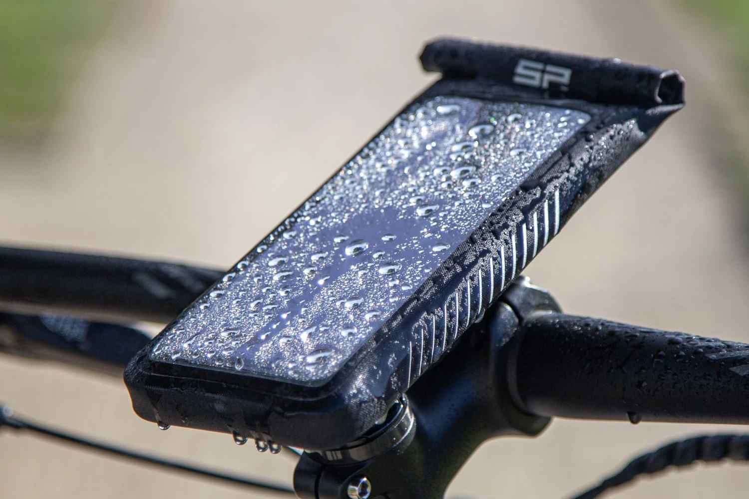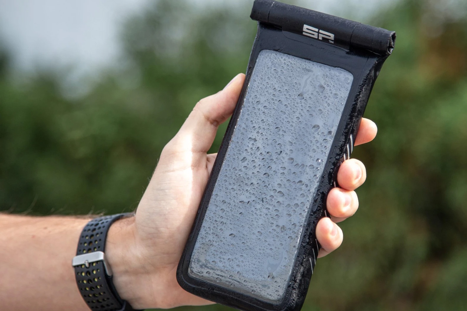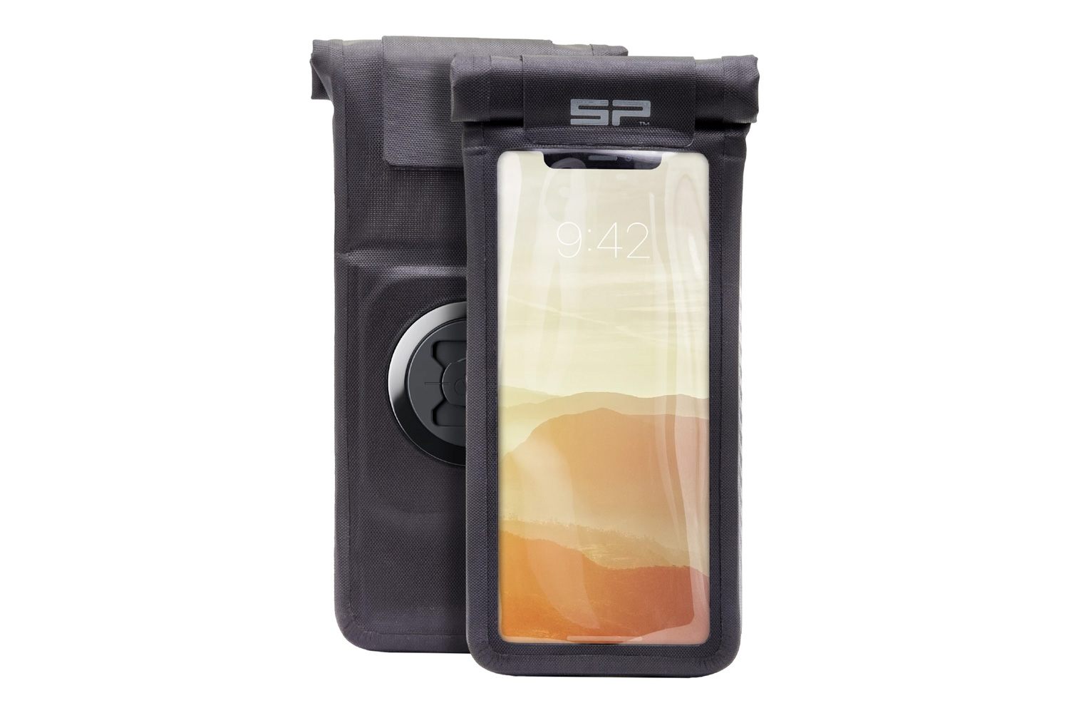 La funda protectora universal SP Connect permite fijar prácticamente cualquier smartphone a cualquier soporte SP Connect para instalar el smartphone en motocicletas, bicicletas, coches, etc. de una manera segura utilizando el mecanismo patentado de cierre giratorio. Tan solo hay que meter el smartphone en la funda, enrollar la abertura de esta última y fijarla con la superficie de gancho y bucle; así, el smartphone queda protegido de la lluvia, el lodo y el polvo sin limitarse la manejabilidad de la pantalla táctil.