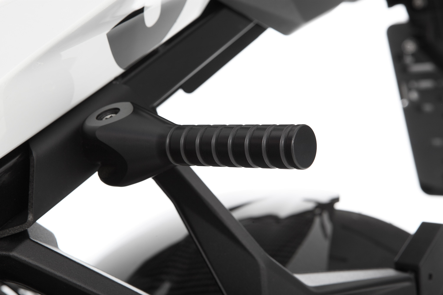 Componente muy útil y ergonómico. Mejora las condiciones para hacer palanca, y no solo con la motocicleta cargada al máximo. Este mango plegable de elevación se monta en el chasis de la estribera izquierda del acompañante utilizando una consola sólida y de adaptación precisa. Cuando se despliega, la motocicleta puede colocarse sobre el caballete central de una manera notablemente más sencilla y segura. Ello es posible gracias a que el mango antideslizante se agarra bien, por lo que puede transmitirse una fuerza significativamente mayor que en los tubos del chasis, ya que estos no pueden agarrarse bien o son inaccesibles a través del equipaje. Después de levantarla, el mango queda oculto en su posición de reposo. Un mecanismo permite bloquear el mango con seguridad en su posición plegada. Fabricamos nuestro mango de elevación con aluminio y aplicando unos estándares muy altos de calidad; asimismo, su diseño es funcional.